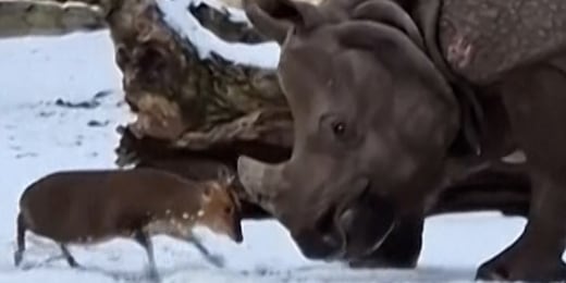 Tiny deer takes on rhino at Polish zoo